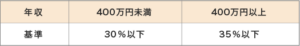 年収に占めるすべての借入れの年間合計返済額の割合(=総返済負担率)が次の基準以下であること。